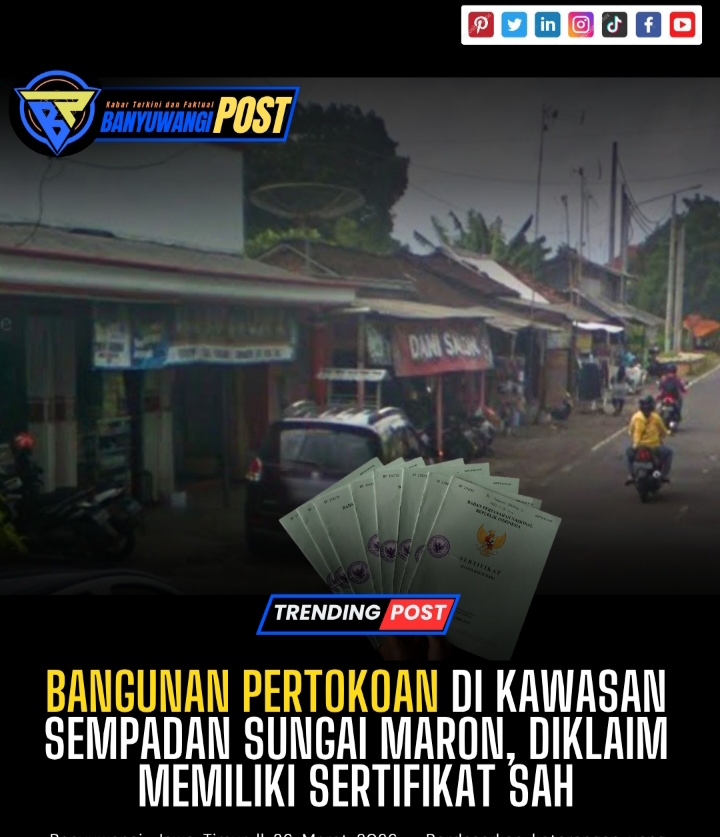 Kali ini, sorotan tertuju pada kawasan sempadan sungai di Dusun Maron, Desa Genteng Kulon, Kecamatan Genteng. Berdasarkan aturan yang berlaku, lokasi tersebut ditetapkan sebagai aset strategis milik negara yang berfungsi menjaga kelestarian ekosistem sungai, mencegah risiko banjir, serta menjamin ketersediaan sumber daya air.