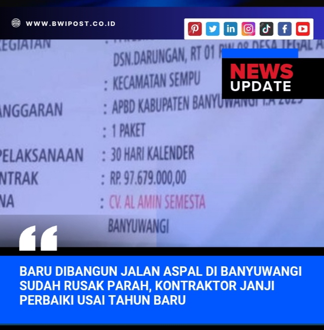 Baru Dibangun Jalan Aspal Di Banyuwangi Sudah Rusak Parah, Kontraktor Janji Perbaiki Usai Tahun Baru