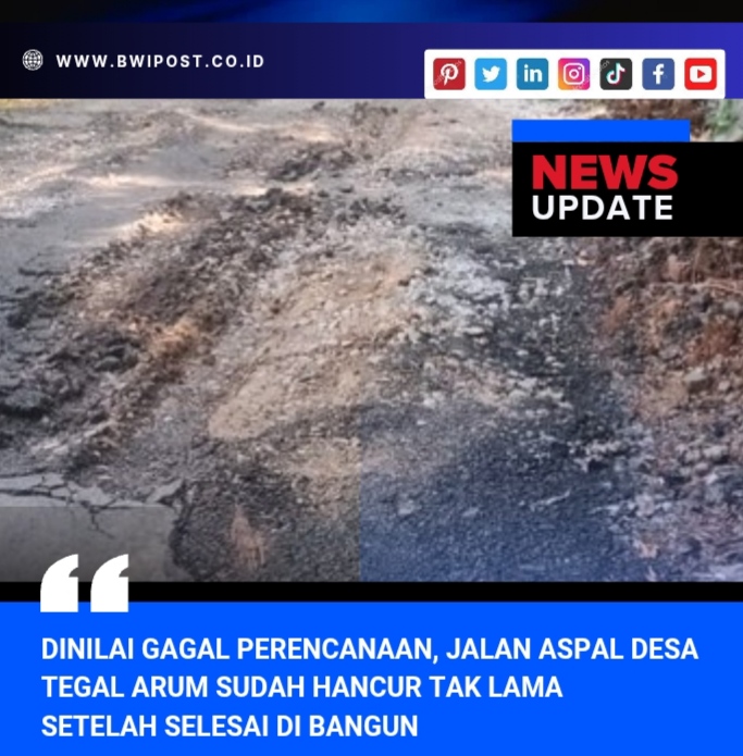 BANYUWANGI,JAWATIMUR –Proyek pembangunan jalan aspal di Desa Tegal Arum, Kecamatan Sempu, Kabupaten Banyuwangi menjadi sorotan publik setelah mengalami kerusakan cukup…